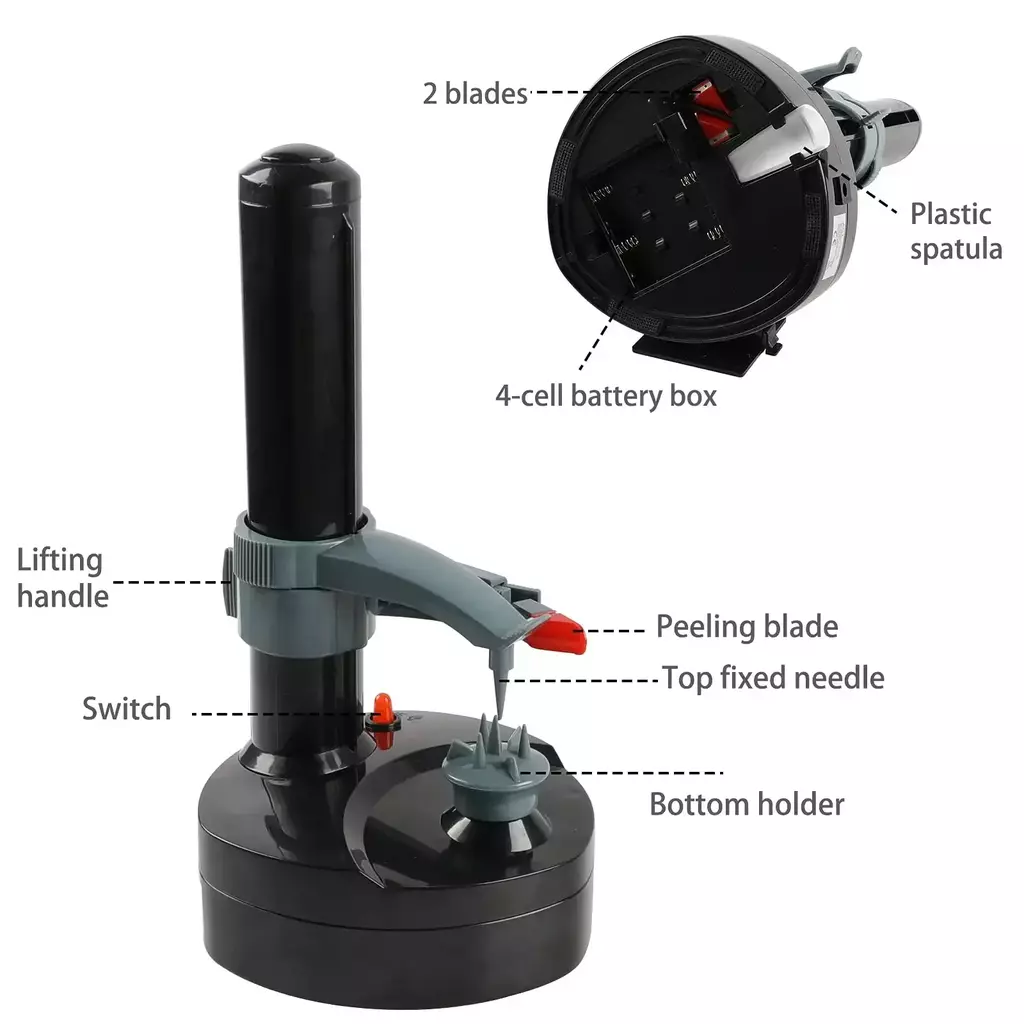 2 modos de energia: O descascador utilitário pode ser usado não apenas com 4 pilhas AA (não incluídas), mas também com um carregador que carrega quando em uso.Potência poderosa e trabalho eficiente.