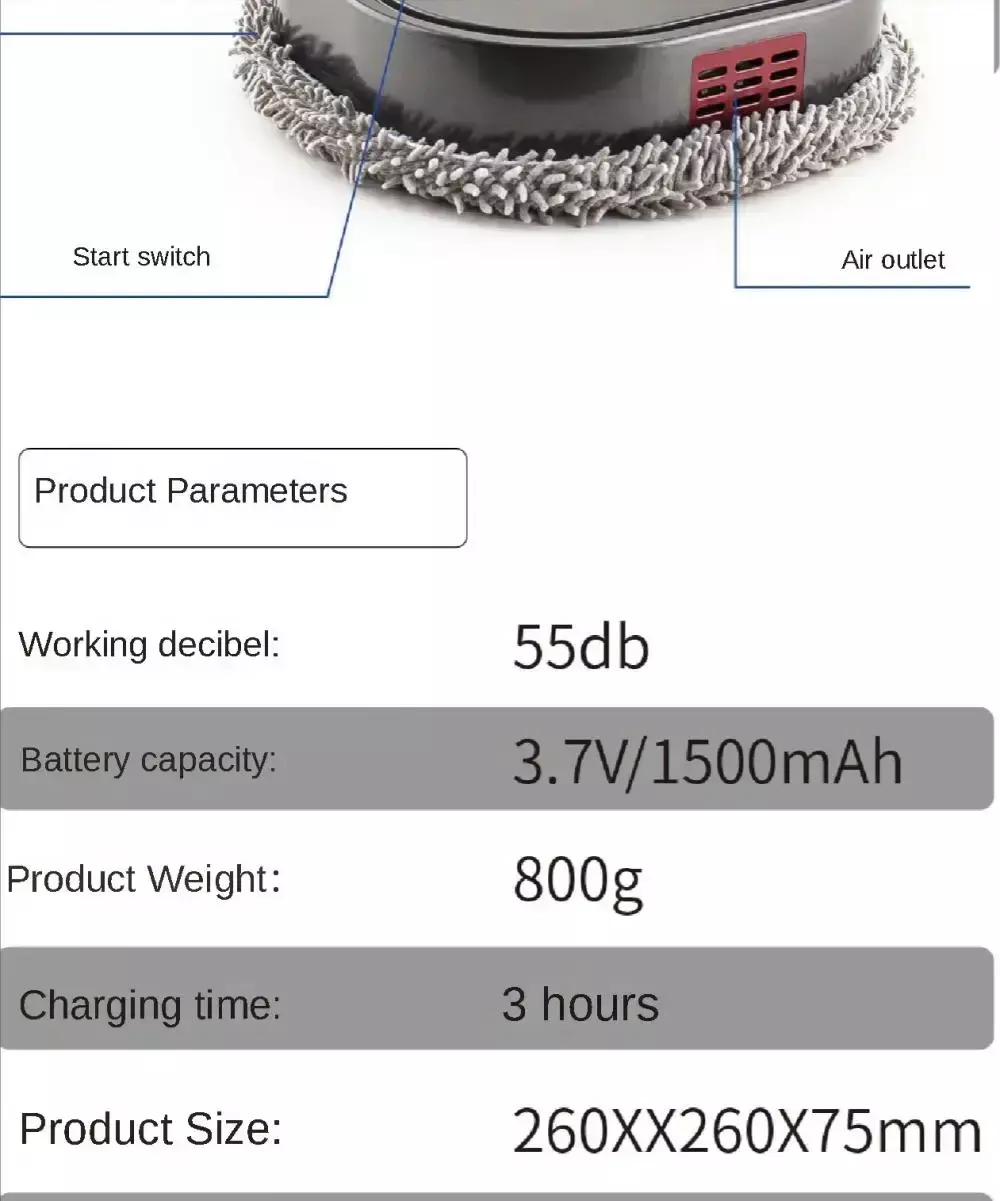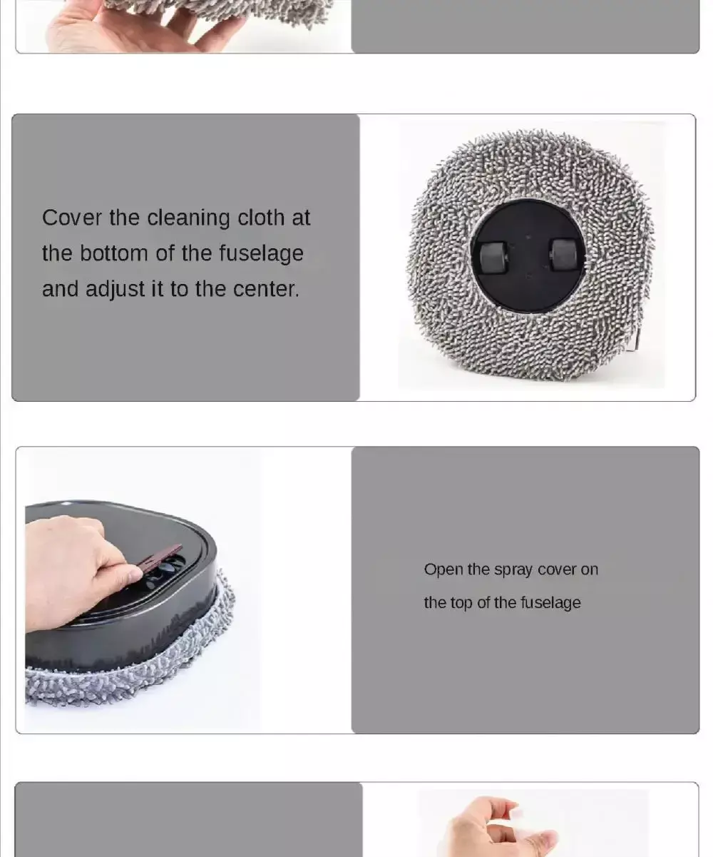 Nove. Instruções de uso: Ligue o interruptor lateral; Molhe e torça o pano de limpeza seco; Cubra o pano de limpeza na parte inferior do corpo da máquina e ajuste-o ao centro; abra a tampa de pulverização no topo da fuselagem; Use um dispensador de água para adicionar a quantidade adequada de água ao bico de pulverização; Pressione suavemente para limpar automaticamente.
