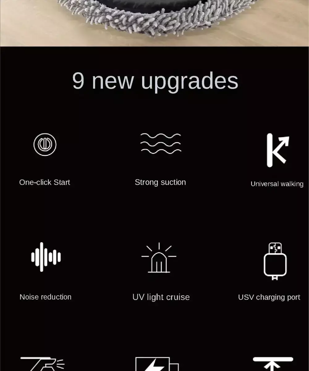 2. Nove novas atualizações. Um botão começar, forte sucção, caminhada universal, redução de ruído, luz UV cruzeiro, porta de carregamento USB, umidificação spray, longa resistência, corpo fino.